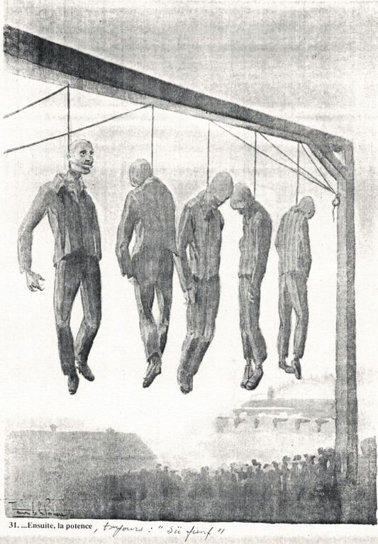 Enfin quand ils ont eu bien ri, le SS a fait signe à 2 stubendienst qui se sont mis en devoir de taper sur le pauvre russe pour lui faire avaler le morceau de choix… Quand il a eu fini, le SS a fait un autre signe, et les autres ont tapé plus fort sur la tête jusqu'à ce que mort s'ensuive.