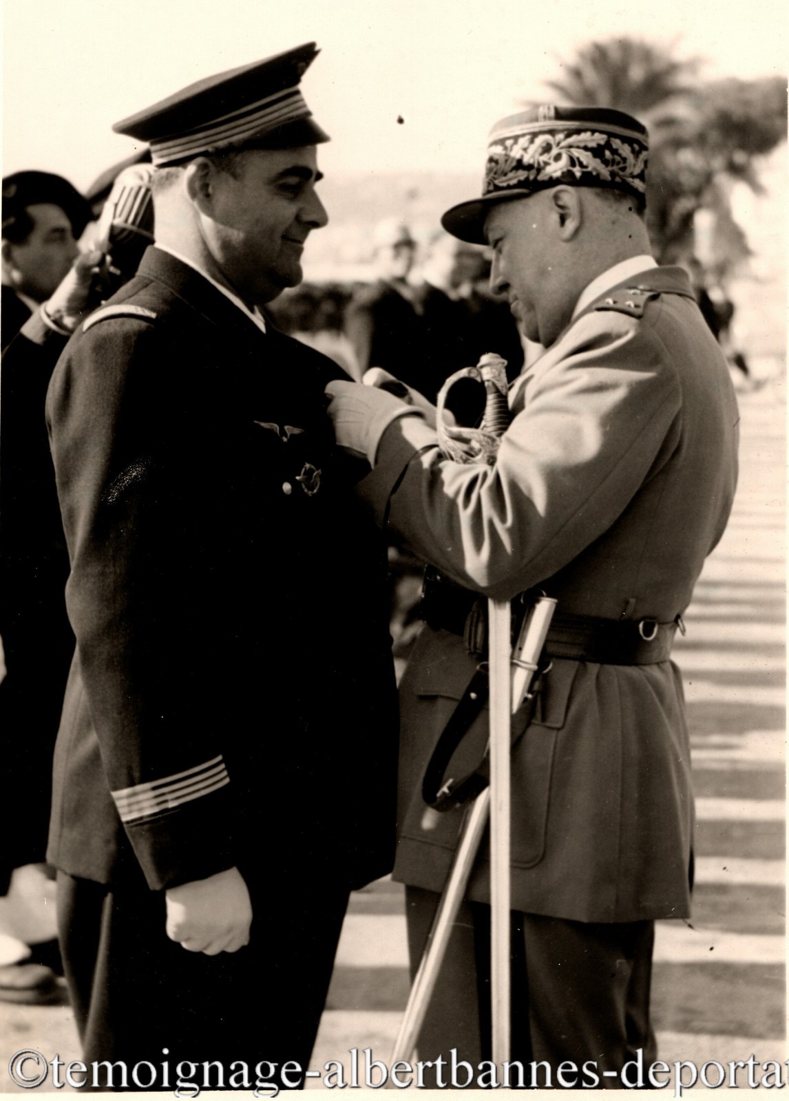 11 novembre 1953 : Albert Bannes décoré officier de la Légion d'honneur à Nice par le général Pierre Dejussieu alias Pontcarral, chef national de l'armée secrète et déporté à Dora